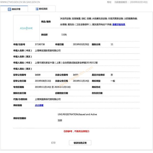 商標注冊證核定使用商品:沐浴用設備; 浴室裝置; 浴缸; 浴霸; 水按摩洗浴設備; 非醫用熏蒸設備; 太陽能集熱器; 坐便器; 盥洗池(衛生設備部件); 盥洗室用電動干手器。