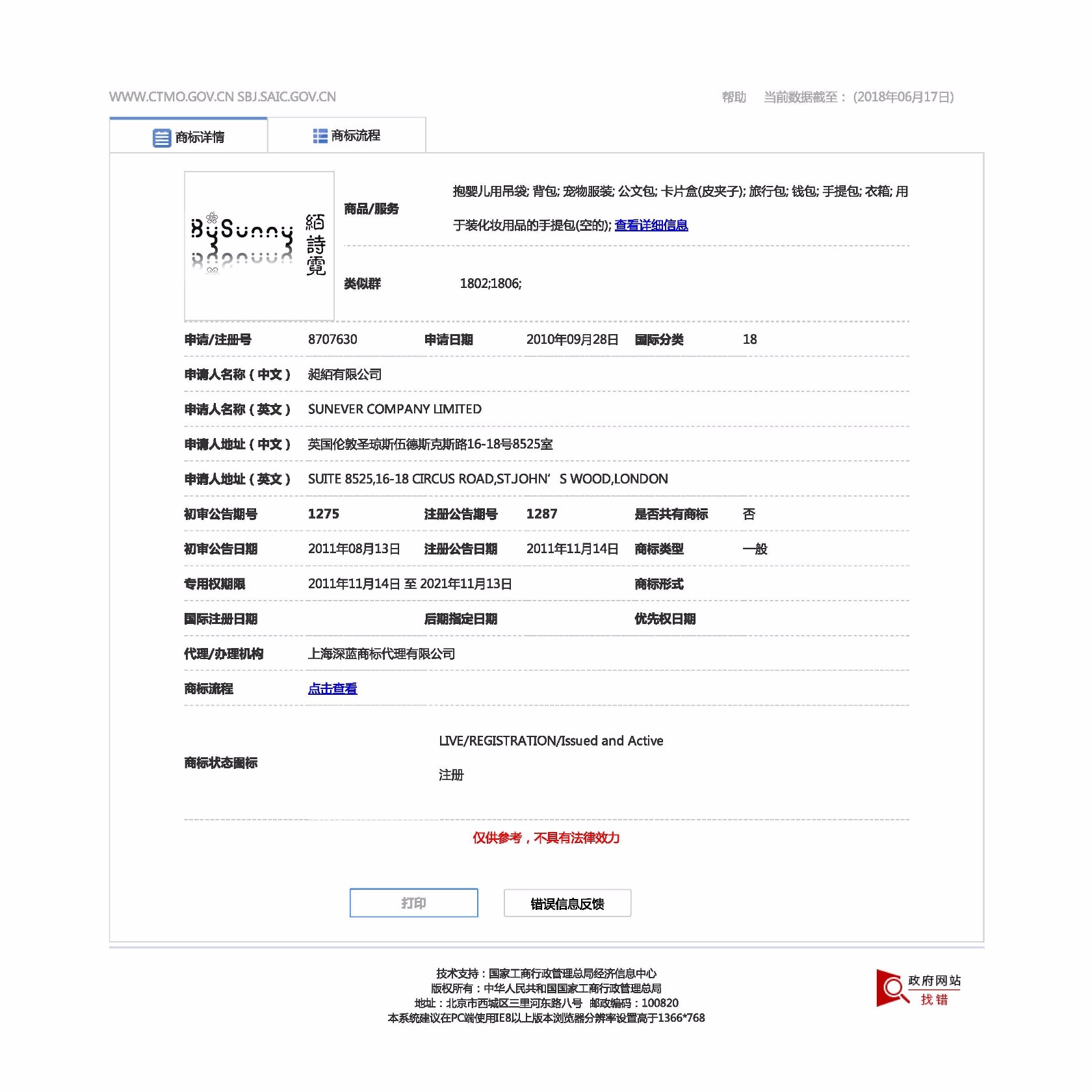 商標(biāo)注冊證核定使用商品:抱嬰兒用吊袋; 背包; 寵物服裝; 公文包; 卡片盒(皮夾子); 旅行包; 錢包; 手提包; 衣箱; 用于裝化妝用品的手提包(空的)。
